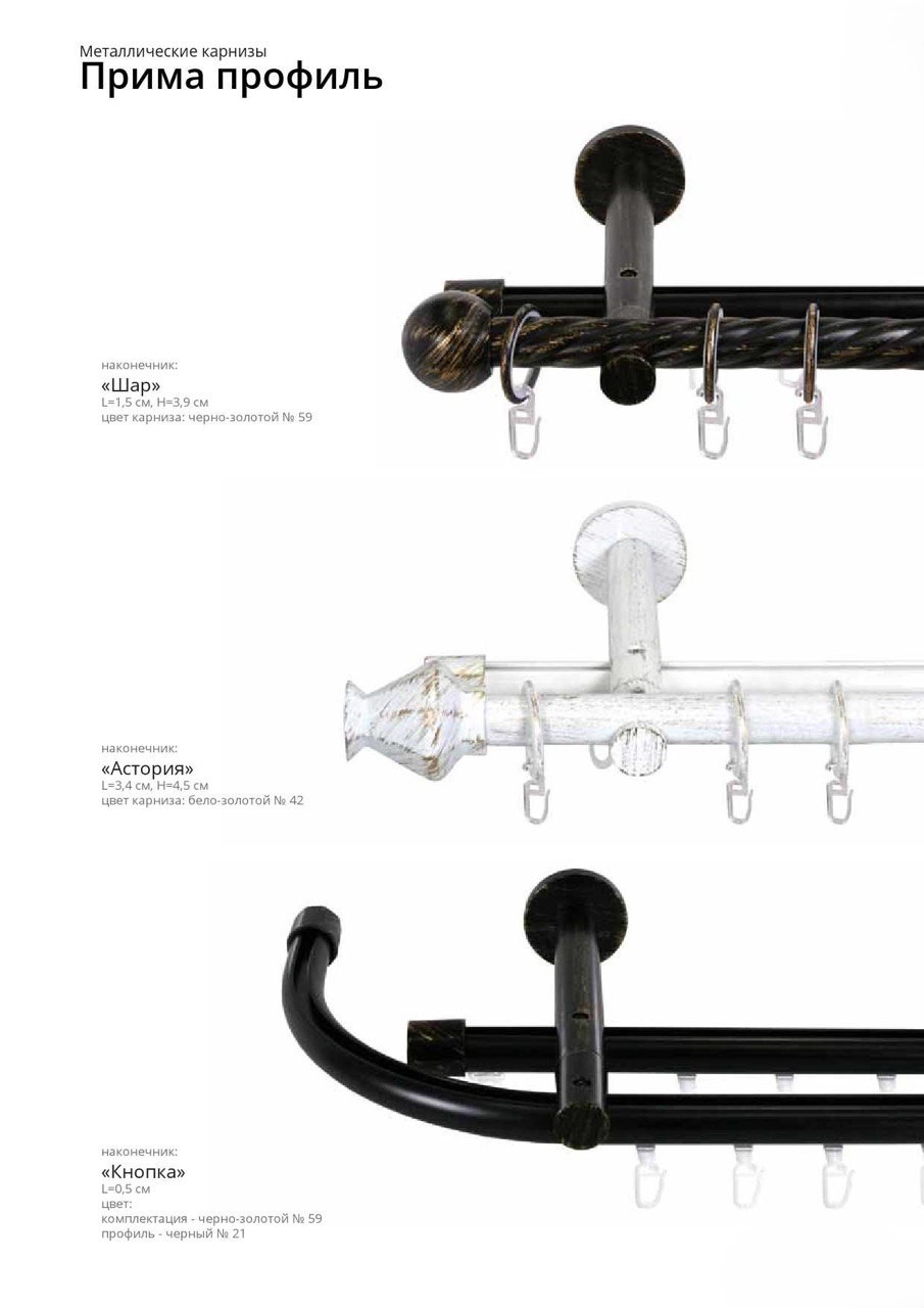 Карнизы «Прима профиль» являются декоративной и оригинальной коллекцией. В коллекции есть круглые трубы D20 мм. Они гармонично сочетаются с кронштейнами и наконечниками геометрической формы. Дизайн коллекции уникальный и неповторимый по форме карнизов и новой цветовой гамме. Однорядные и двухрядные универсальные кронштейны позволяют устанавливать профили и трубы в различных комбинациях. Возможны изготовления угловых загибов профиля.
